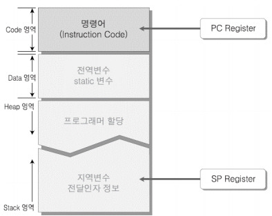 - code : 기계어 (코드를 컴파일하여 기계어로 만들고 디스 어셈블을 하여 어셈블리어로 바꾸어 code 영역에 넣는다(instruction))